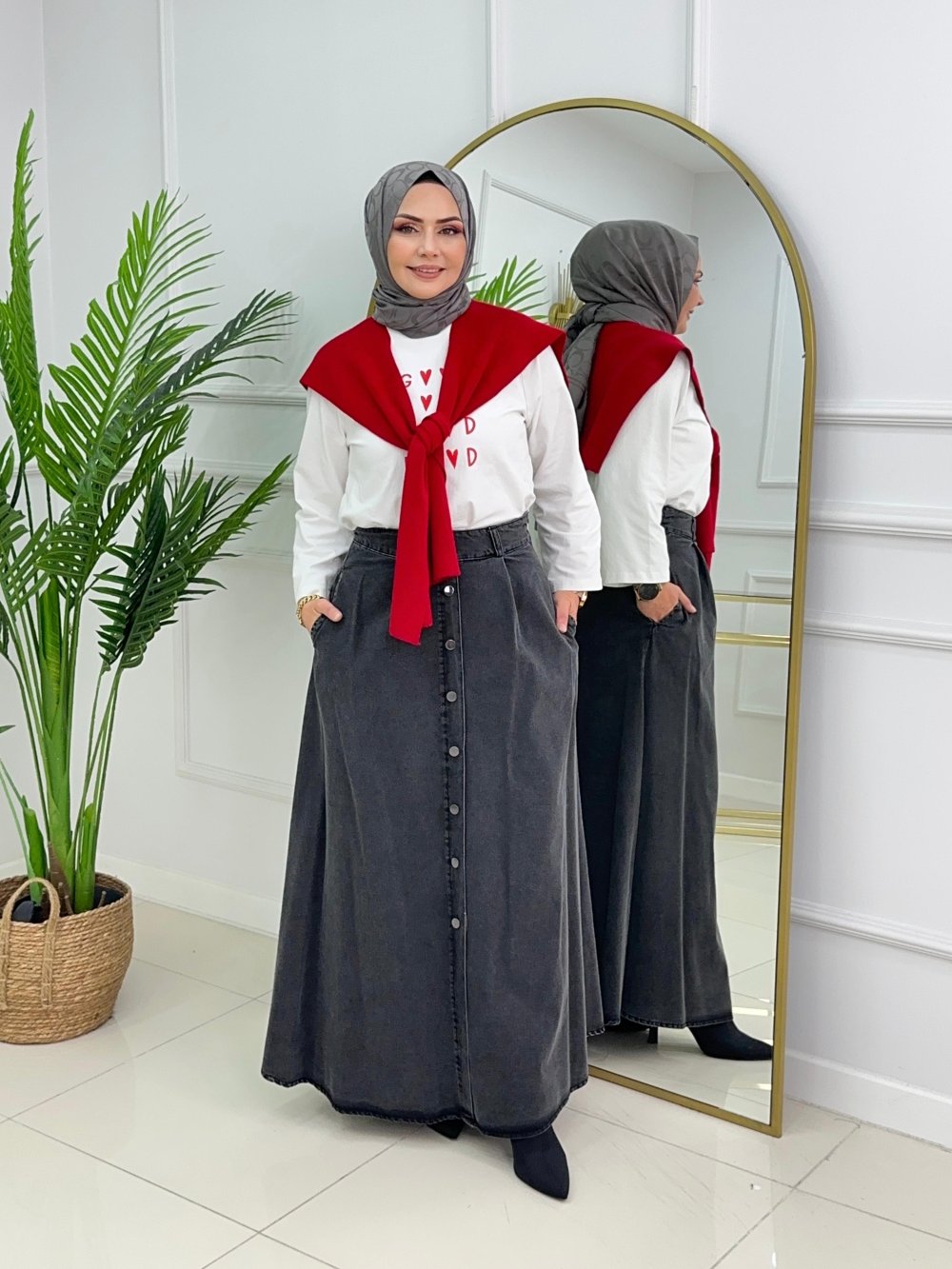 DÜĞMELİ DENİM ETEK - DUMAN Duman